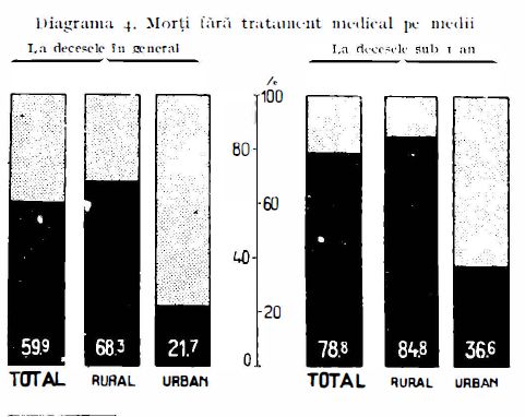 După cum recunoşteau oficialităţile vremii, „marea masă a populaţiunii noastre este practic lipsită de orice asistenţă medicală”. Potrivit datelor Institutului Central de Statistică, dintr-un total de 511.901 copii născuţi în anul 1935 în comunele rurale, numai 36,6% naşteri au fost asistate de moaşe cu diplomă şi 0,7% de medic, restul, adică 62,7%, au fost îngrijite de moaşe empirice, lipsite de cele mai elementare noţiuni medicale. Ilustrativ este şi faptul că din copii cu vârsta până la un an, morţi în cursul anului 1936, numai 22,2% au fost văzuţi de un medic! 78,8% au murit fără nici cea mai elementară asistenţă medicală. Raportat la totalul deceselor – copii şi adulţi – abia 31,7% beneficiau de îngrijire medicală, iar restul de 68,3% mureau fără a fi fost măcar văzuţi de un medic sau de personalul medical auxiliar.