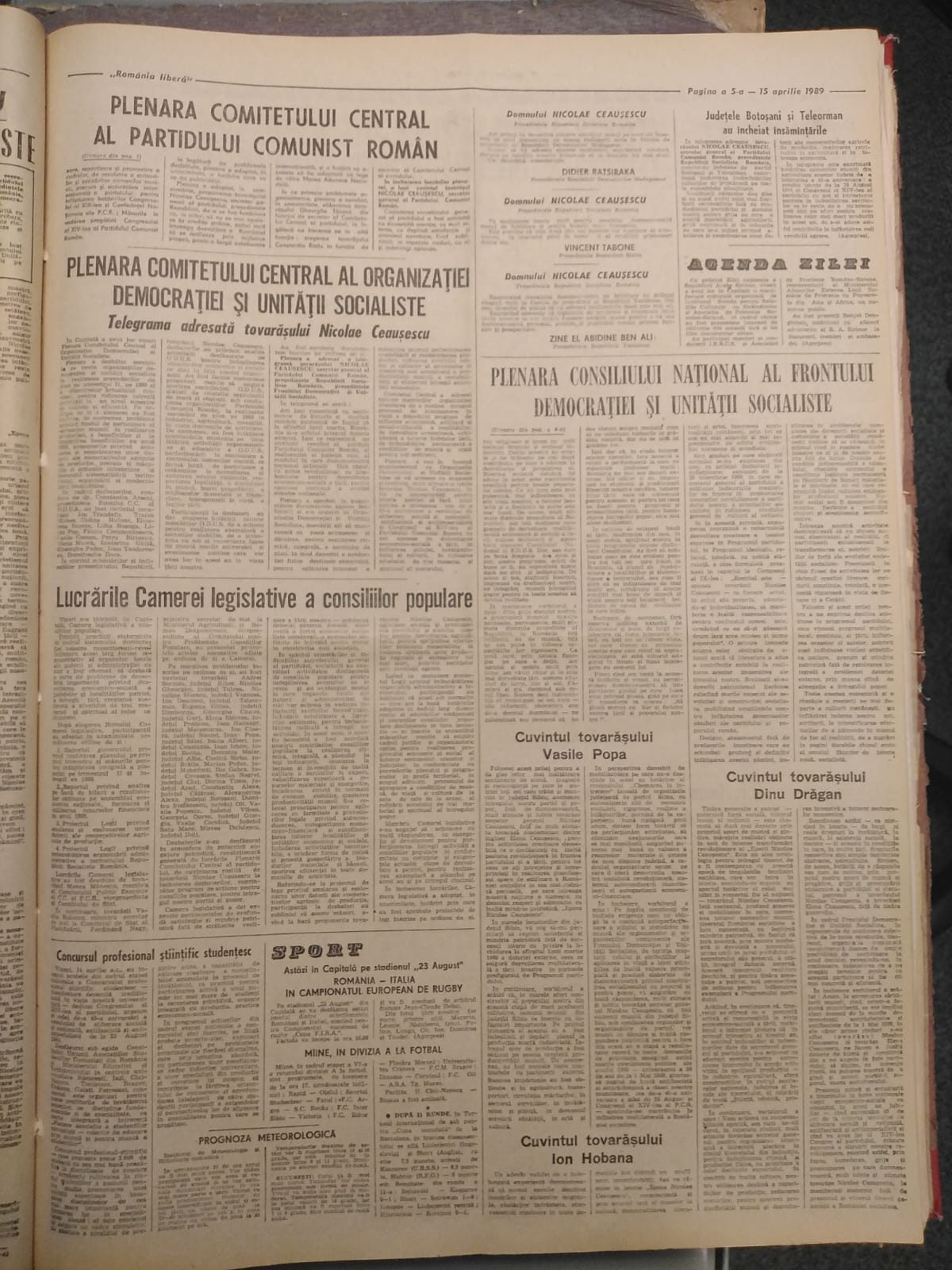 În 14 aprilie, paginile întâi erau identice: în stânga, adică în ”deschidere” era discursul de la Plenara Comitetului Central al Partidului Comunist Român, iar în dreapta, ca un fel de ”text 2”, era cuvântarea de la Plenara Consiliului Național al Frontului Democrației și Unității Socialiste. FDUS era un conglomerat care aduna tot ce ”scăpase” din PCR. De altfel, așa cum veți vedea în revistă, discursul de la FDUS este început de Ceaușescu prin invocarea deciziilor luate dimineață la CC al PCR.