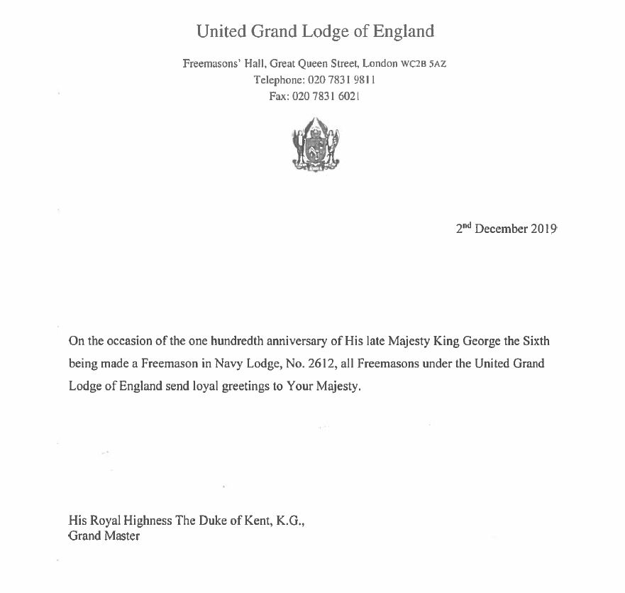 E vorba de două hârtii, cu texte scurte și pe înțelesul tuturor. Prima, datată 2 decembrie 2019, și este semnată de Alteța Sa Ducele de Kent, Marele Maestru al Marii Loji: ”Cu ocazia aniversării a o sută de ani de când Majestatea Sa regretatul Rege George al VI-lea a fost făcut mason în Loja Navy nr. 2612, toți francmasonii din Marea Lojă Unită a Angliei transmit salutul loial Majestății Voastre.”